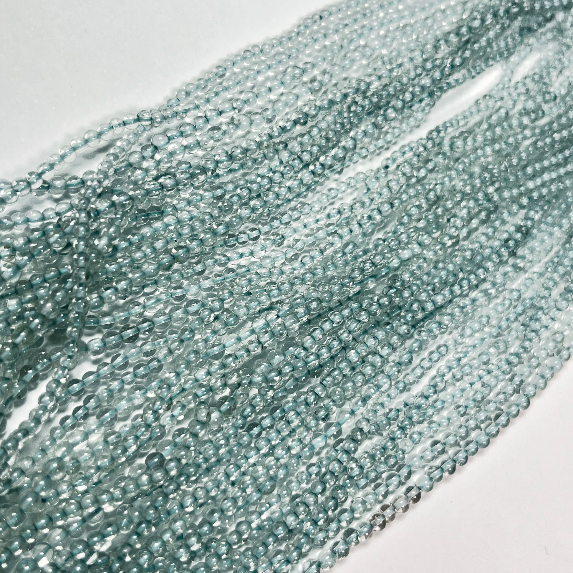 Natural Smooth Swiss Blue Topaz beads displaying vibrant blue tones and clean faceting in a 3.5mm size. Each 14.5" strand weighs approx. 4g and includes about 100–105 beads.