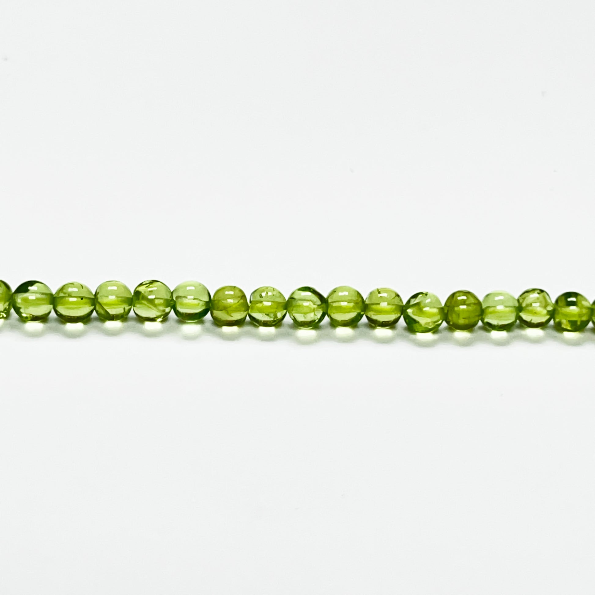 Natural 3mm smooth round peridot beads with green coloration and a polished finish. Available in 14.5" strands containing approximately 131 beads.