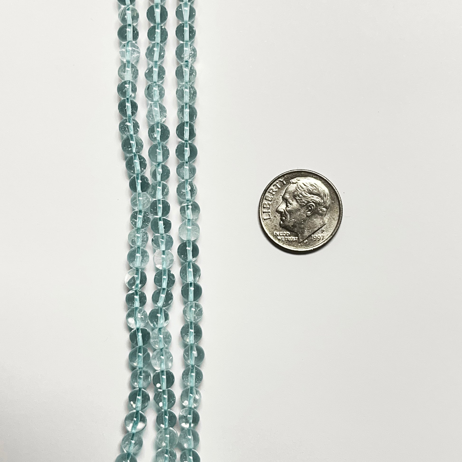 Natural Smooth Swiss Blue Topaz beads with eye-catching sparkle and a smooth 4.6–5mm size range. Each 14.5" strand weighs approx. 6.5g and contains around 80–85 beads.