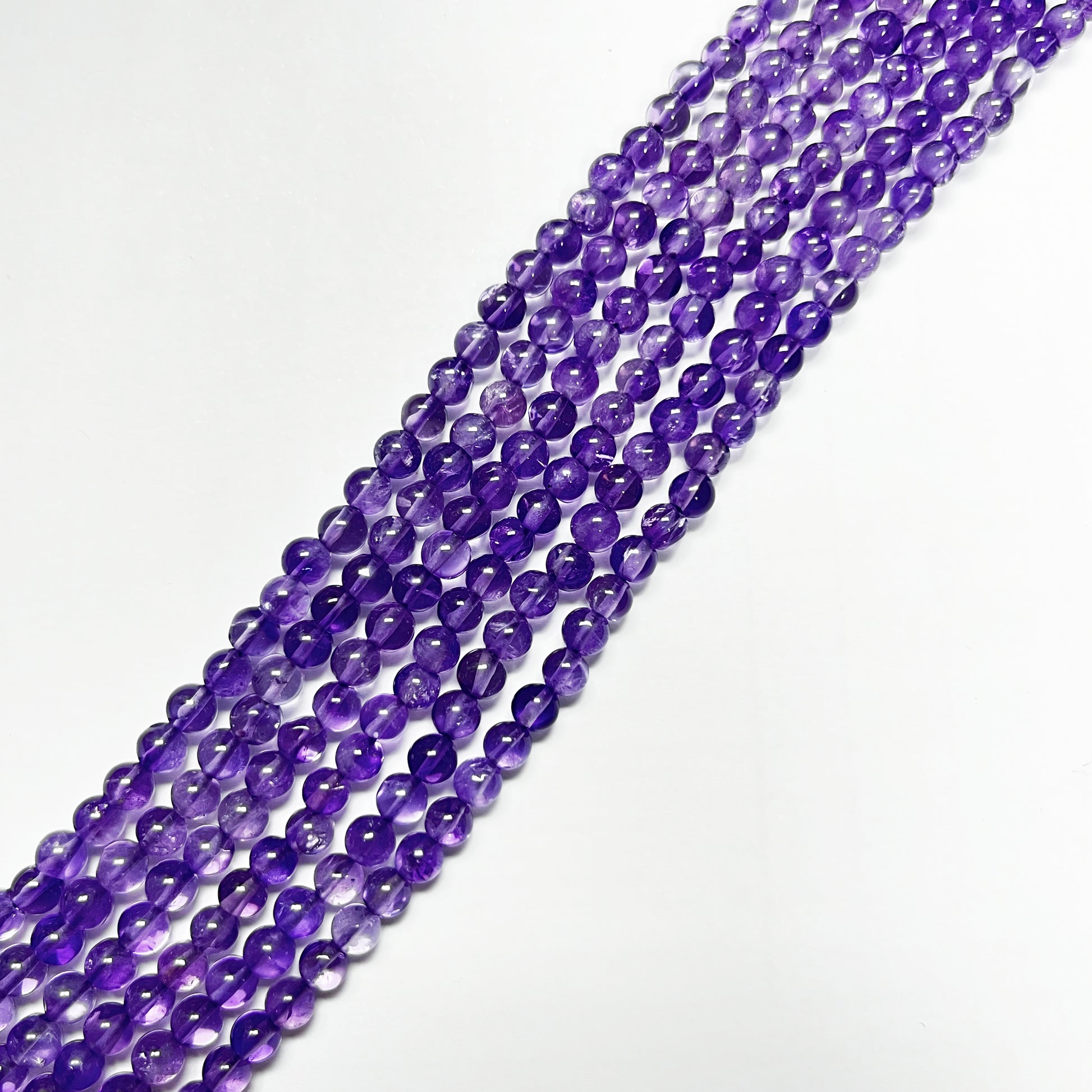 Natural 5–5.4mm smooth round amethyst beads displaying deeper purple tones and a smooth polished finish. Available in 14.5" strands containing approximately 76 beads.