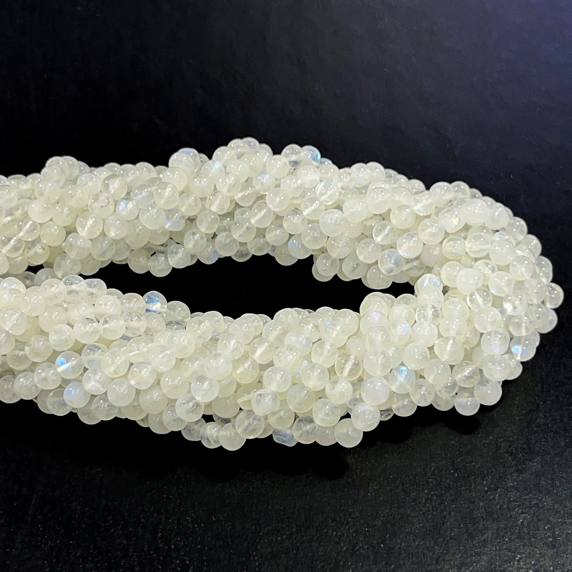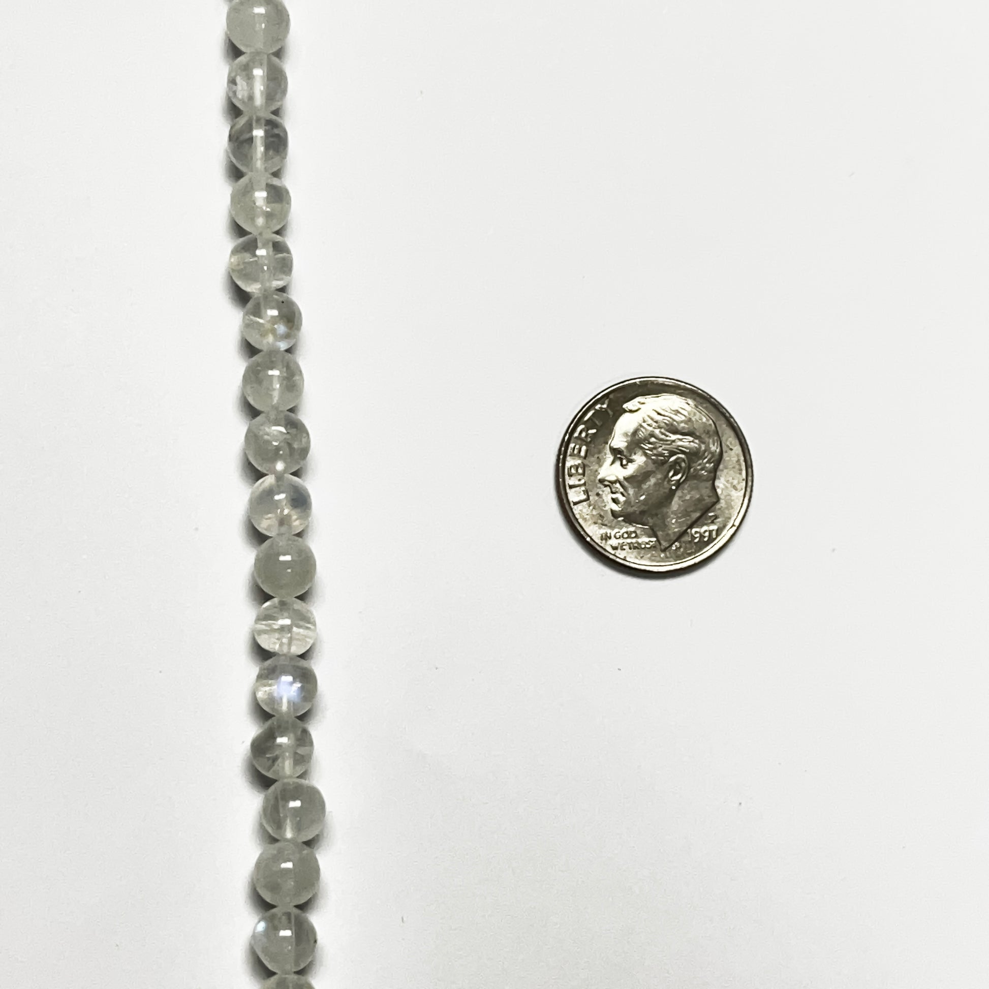 Natural 5.5–5.9mm smooth round rainbow moonstone beads showing translucent body color and natural sheen. Available in 14.5" strands containing approximately 69 beads.