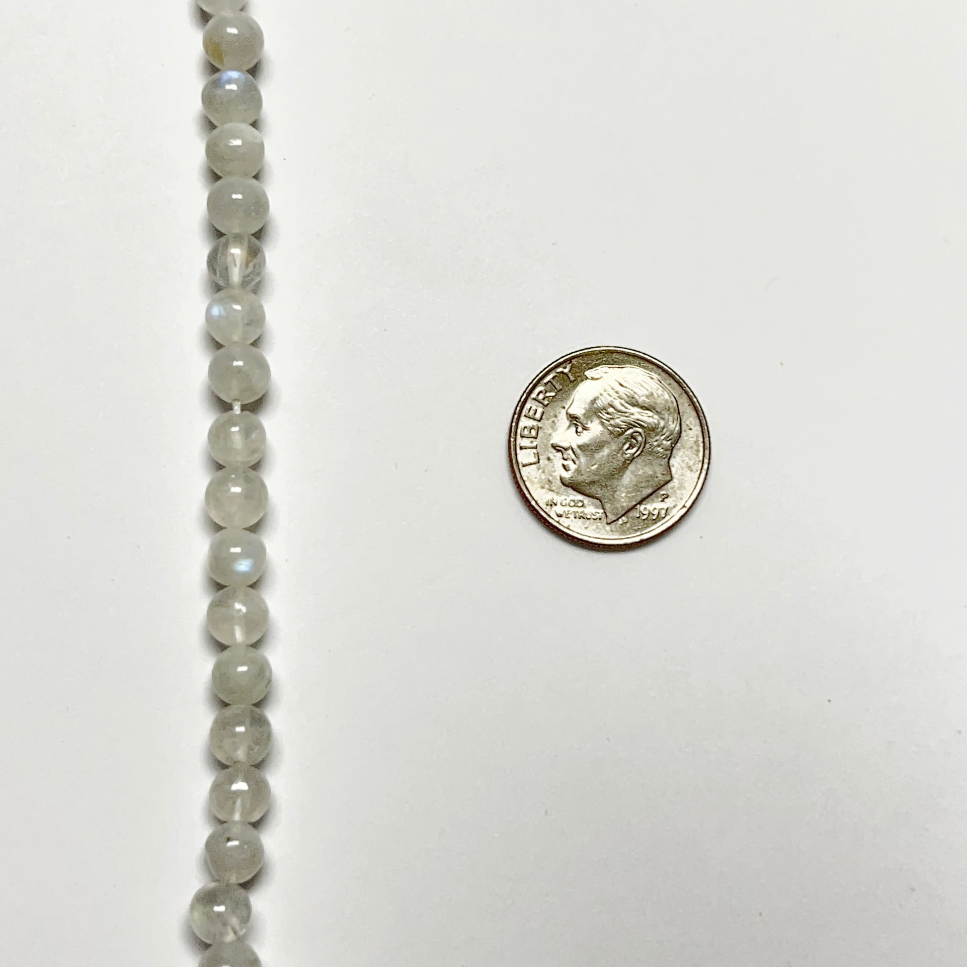 Natural 5–5.5mm smooth round rainbow moonstone beads featuring visible adularescence and a smooth finish. Available in 14.5" strands containing approximately 75 beads.
